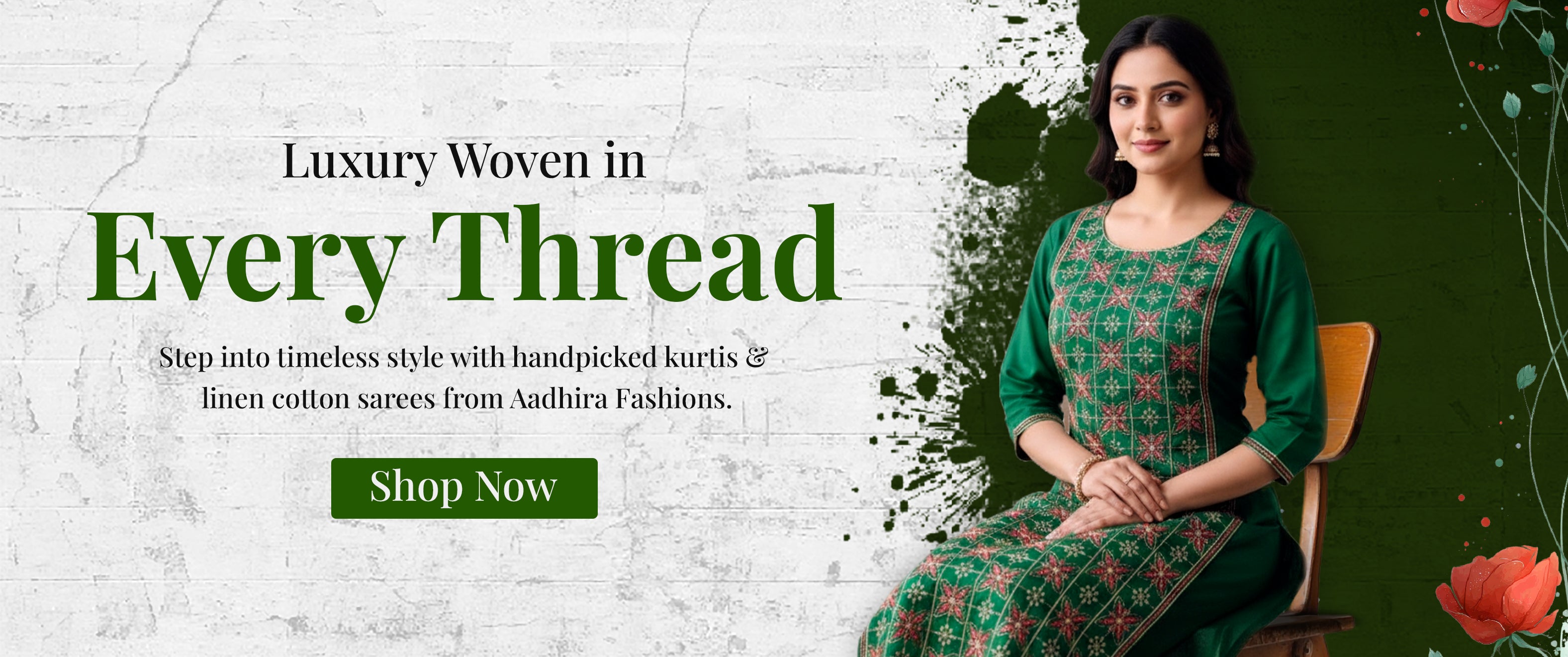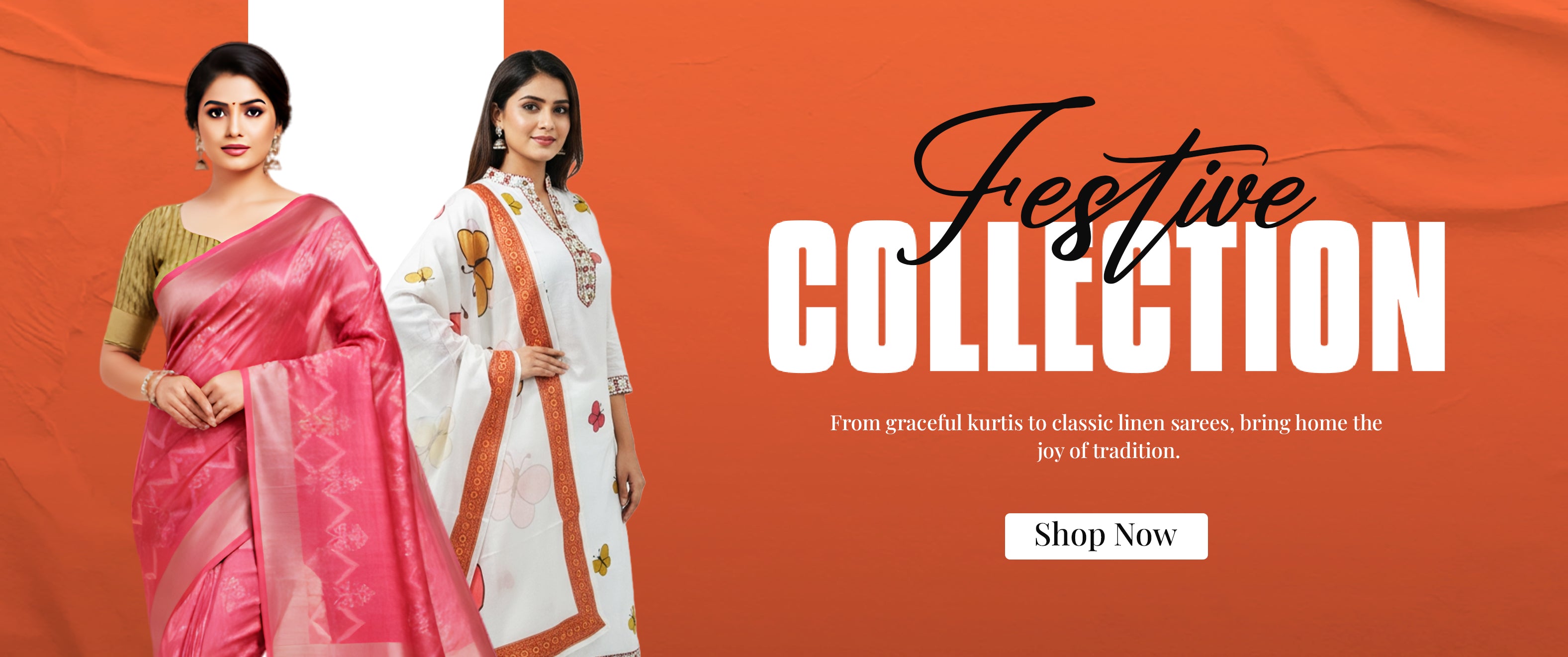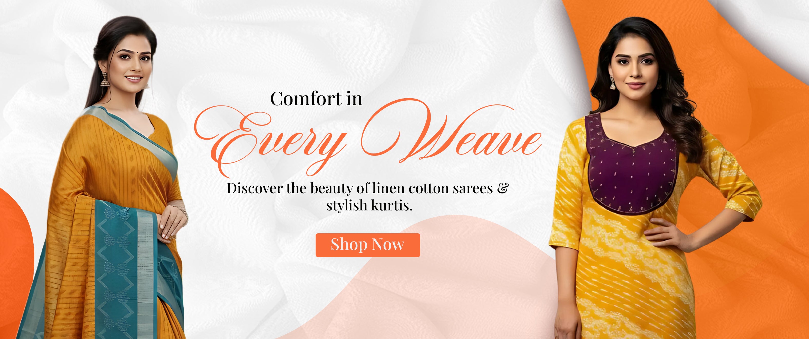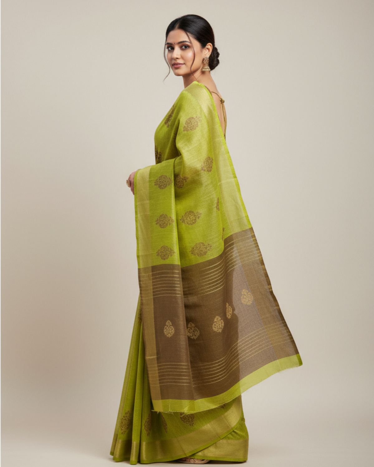 A timeless linen-cotton saree with a modern touch, paired with a matching blouse piece- lightweight, graceful.