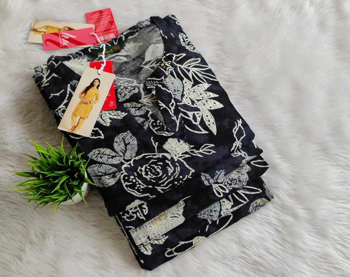 Effortlessly stylish and versatile, this beautifully printed black kurti pairs well with leggings, palazzos, or jeans—ideal for creating a polished everyday look.