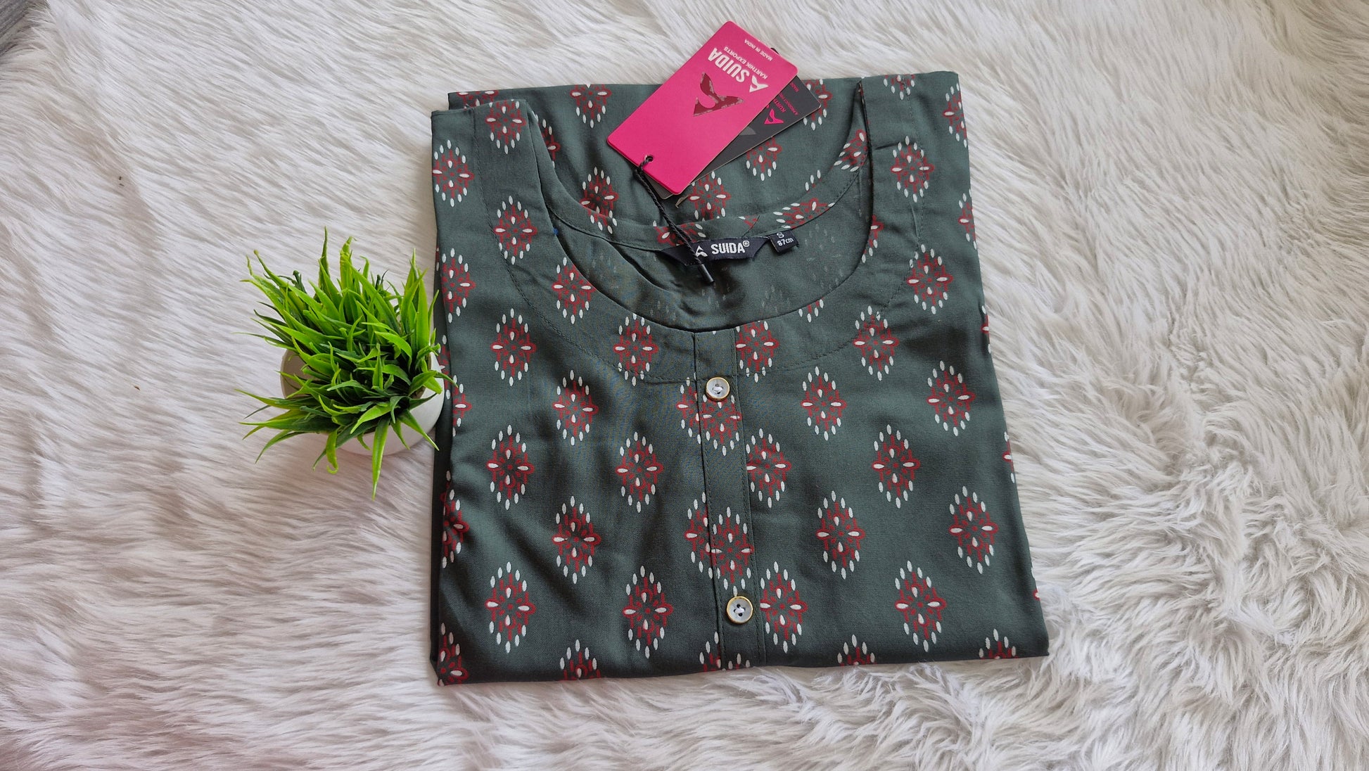 Showcasing a refined deep green base, this kurti features a beautiful red and white ethnic motif print that adds a touch of charm and tradition. The round neckline with a simple buttoned placket gives it a neat and elegant finish, making it perfect for casual outings, office wear, or daily styling.