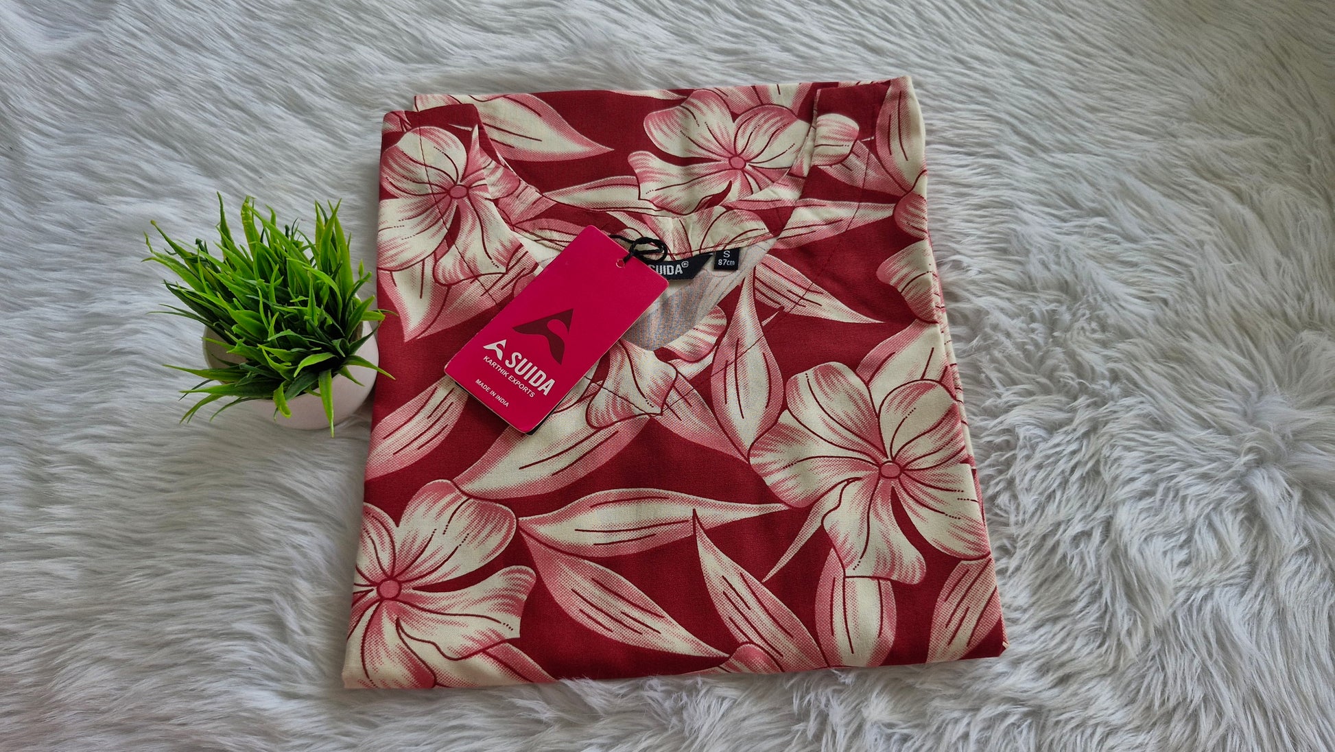 This stylish kurti features a rich maroon base adorned with an elegant off-white floral print. The vibrant, tropical-inspired pattern adds a lively and refreshing touch, while the V-neckline keeps the look simple and versatile. Perfect for casual outings, daily wear, or relaxed gatherings, it offers an effortlessly chic appearance.